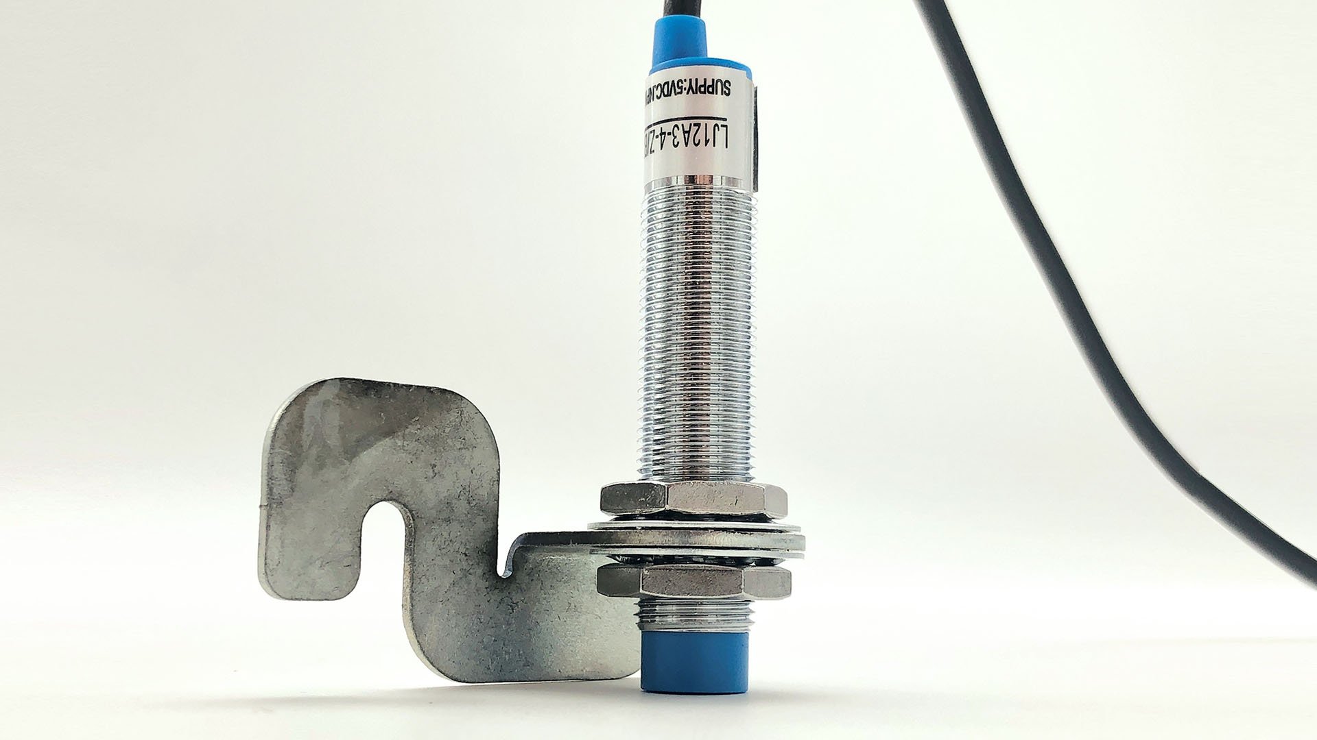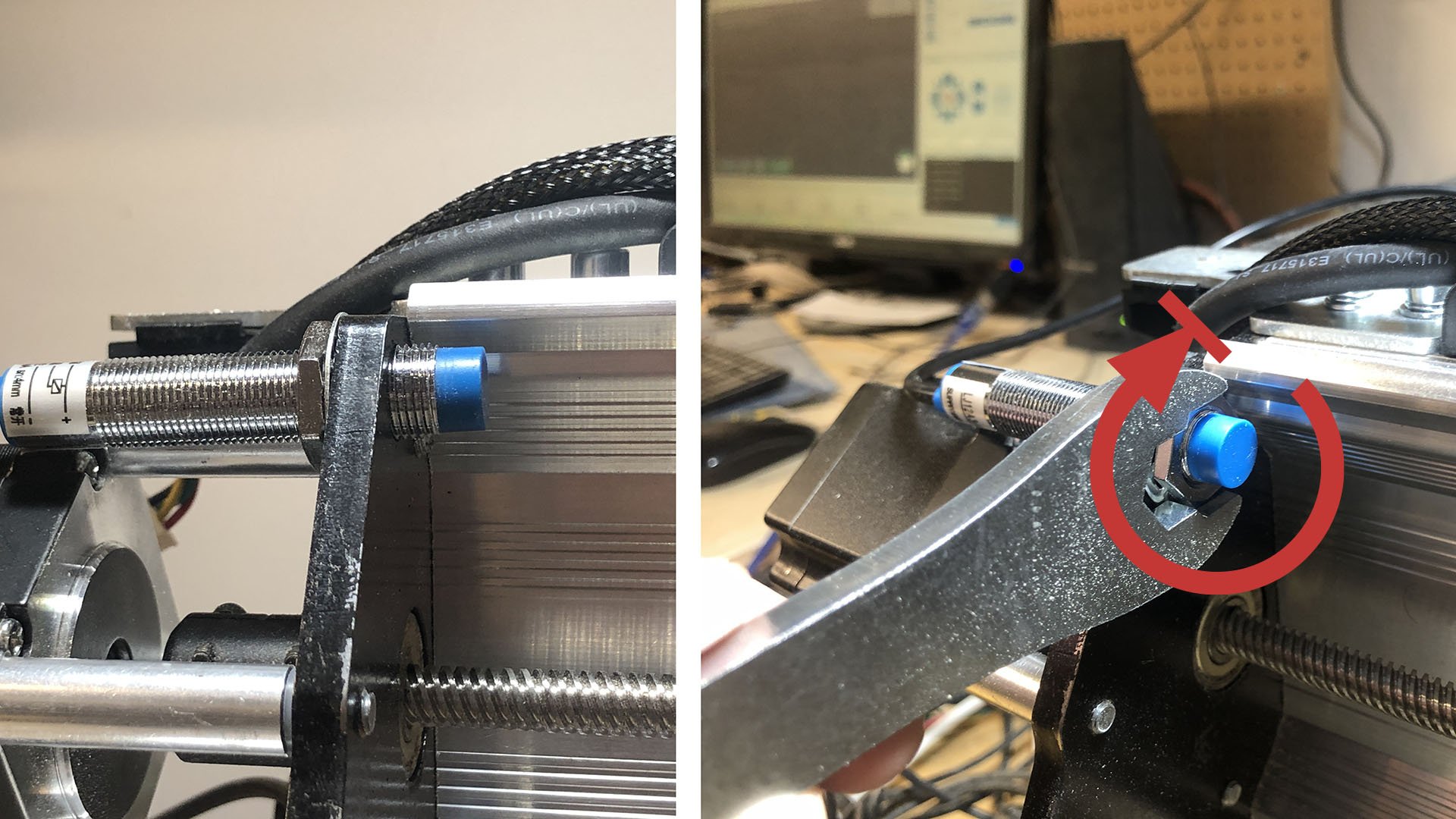 The Y-axis sensor uses a bracket to mount onto the underside of the Y-axis rail. Install the inductive sensor into the bracket by unscrewing the nut and washer from the sensor. Pass the sensor through the large hole on the mount, then reinstall the washer and nut. You’ll want to adjust where the sensor sits on the bracket so that the face of the blue tip is flush with the edge of the bracket as shown below.