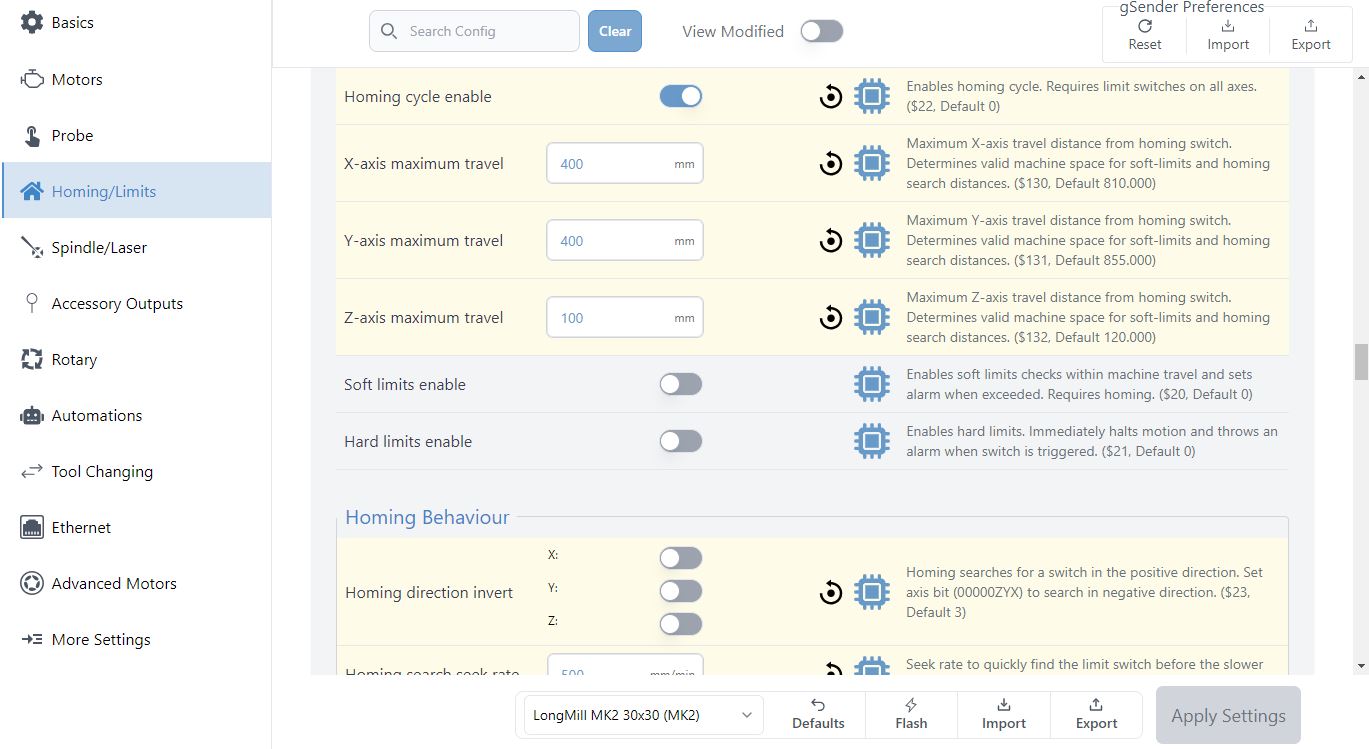 In some g-code senders you’ll need to send these changes manually using their console, for instance typing “$22 = 1” to enable homing. However, the Current version of gSender has a Homing/Limits tab in the Config screen, and Classic gSender has a ‘Firmware’ tool available at the top-right. Here you can scroll around to browse limit switch settings and enable any you feel will be useful to you.
