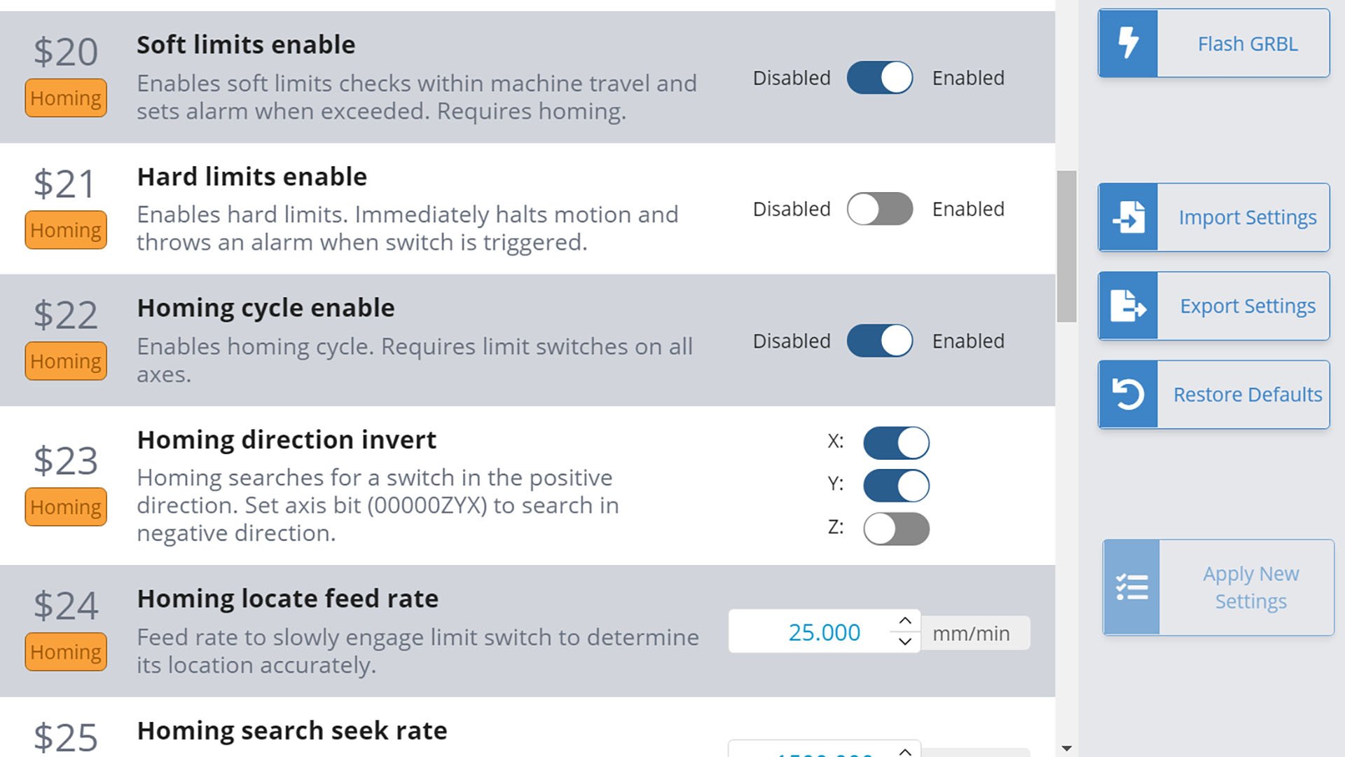 | $25 – Homing seek rate | By default, this speed is set to 1500 mm/min ($25=1500). This is the speed the machine will initially move towards each limit switch to first roughly locate where each limit switch is. This value can be set higher when used with non-interference limit switches that are not damaged if the travel limit is accidentally exceeded. |