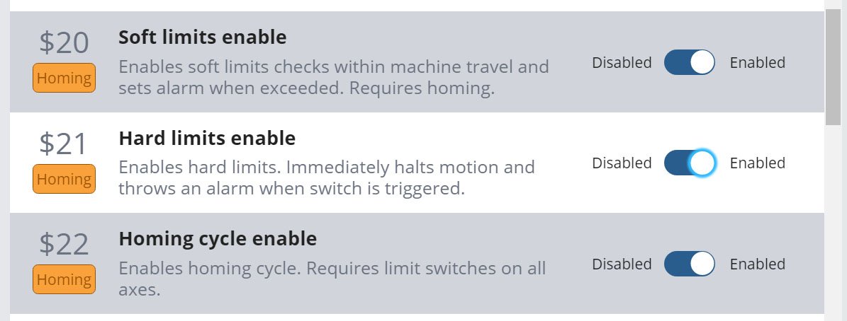 Homing Cycle: if your machine has been unpowered, lost power, or lost its location for any reason then it won’t have any reference to where it is. Homing will reliably place your machine by prompting you to ‘home’ anytime you connect to it, allowing it to move toward the ‘home’ position, detect that location using limit switches, and then say “yep, now I know exactly where I am.” This can be used to resume a previous job, apply work offsets for jigs, apply safe height to your quick travel movements to avoid bit collisions, or even set up a tool changing station.