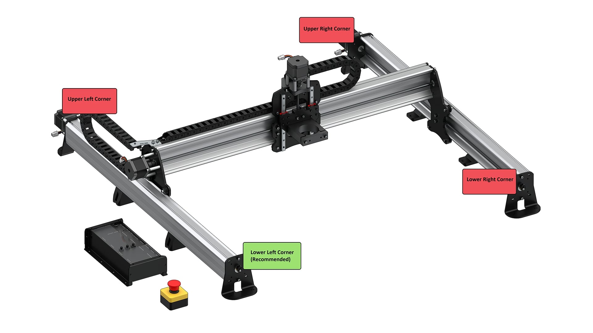Before you begin, you will have to decide where you want your machine to home to since this will decide where you place your sensors. The Z-axis will always home to the top, but X and Y can home to any of the 4 corners of the machine’s travel. We recommend homing to the front left or back left corners because: