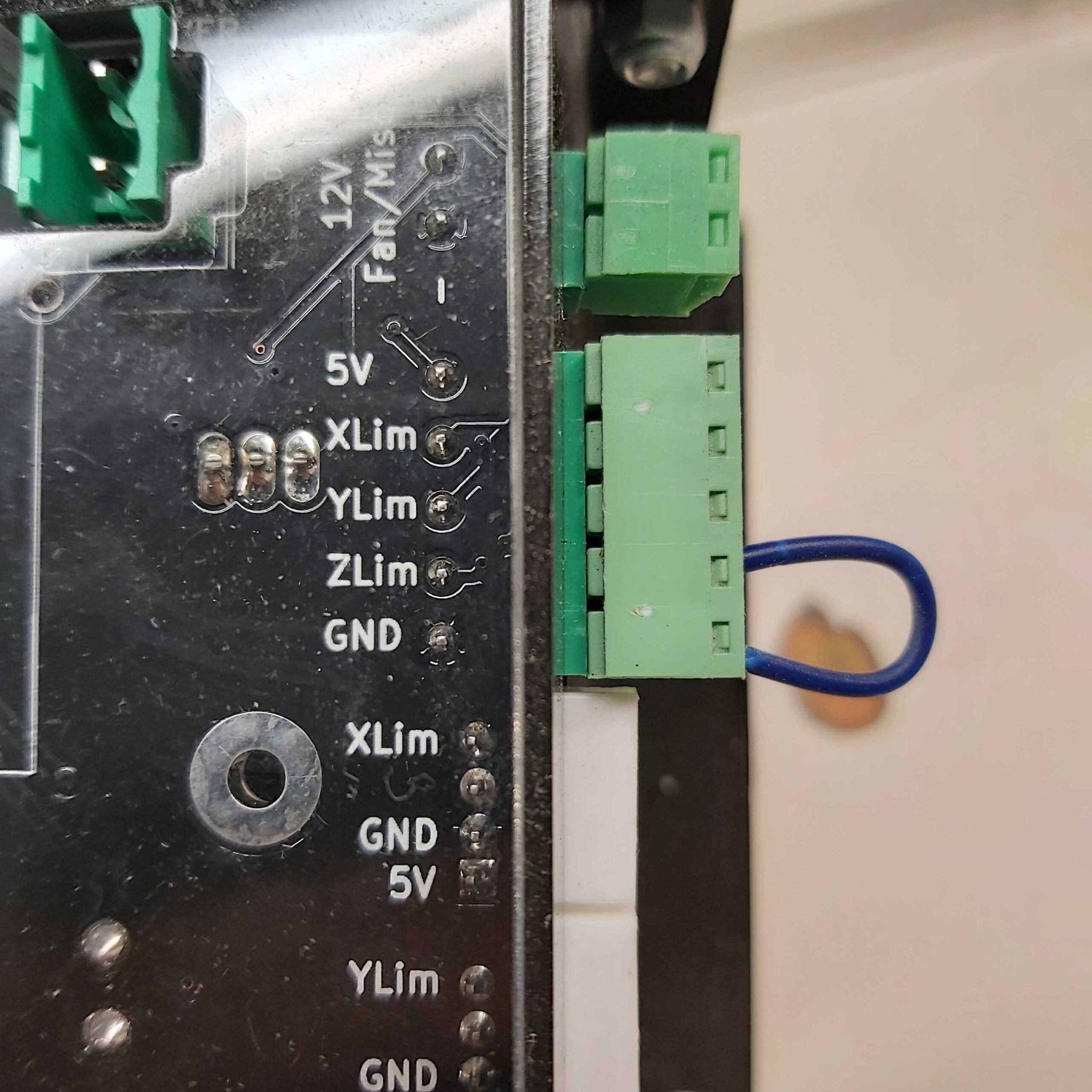 To further test the controller please take a small length of wire and install it as the image below. One end will be in either the XLim, YLim, or ZLim pin (depending on the limit switch with the issue) and the other in the GND pin.