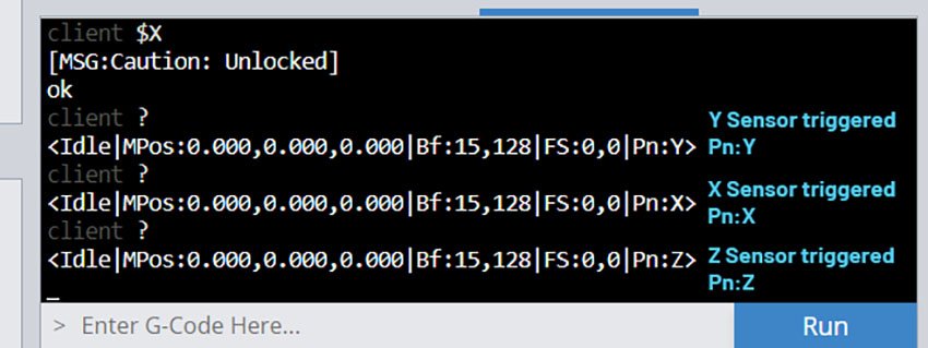 If all sensors are reporting correctly, another check to make is that there’s nothing preventing the machine from reaching the sensor. It shouldn’t be colliding or be too far away that the machine isn’t activating the red light on the sensor. Once troubleshooting is complete be sure to send “$10=3” in the console to exit from the special reporting state.