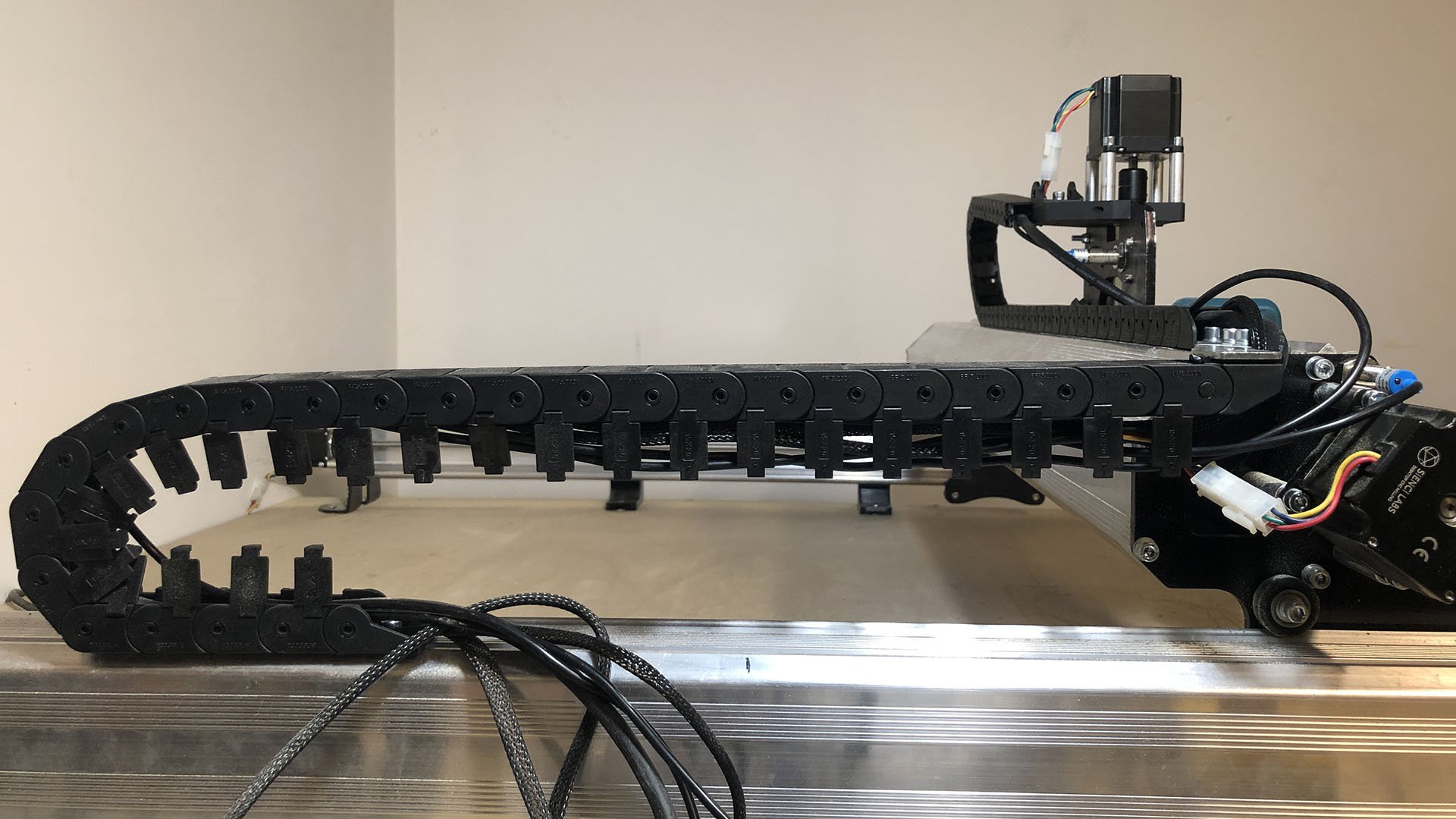 Routing the cables from the inductive sensors happens similarly to the original machine assembly. Un-clipping both drag chains the X and Z-axis sensor wires will follow the stepper motor wire near them and be closed in again once you’re confident the sensors are working and correctly placed. The Y-axis sensor cable will run straight to the control box. You can label these as you route them if it helps keep track of each but their length is also an easy way to check where they come from.