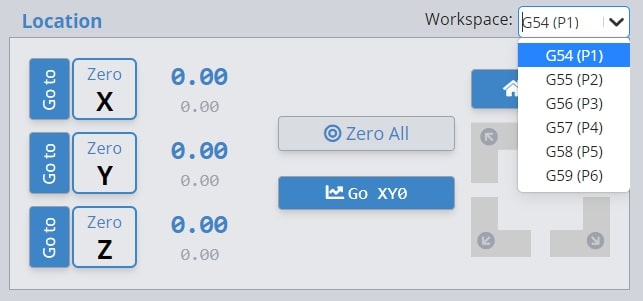 To change work offsets or workspaces, simply select one of the 6 workspaces from the drop down list in the top right corner of gSender as shown in the photo below. Alternatively, entering the commands G54, G55, G56.. etc. into the console of gSender or UGS will tell the machine to switch into that workspace. You will notice the work coordinates (blue numbers) will change upon switching workspaces to whatever the coordinates are within the new workspace. The machine coordinates (grey numbers) will always remain the same regardless, as these are relative to your machine’s home position.