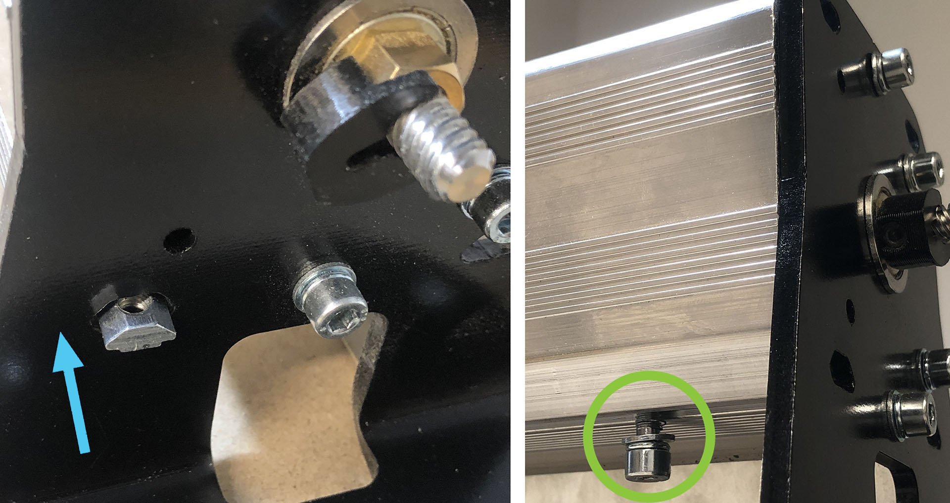 To mount this bracket and sensor to the rail, first slide the t-nut into the bottom t-slot of the rail (pictured) until the t-nut is about 1” from the front foot. Start threading the M5-10mm screw into the t-nut but leave a gap so the bracket can be slid between the head of the screw and the bottom of the rail.