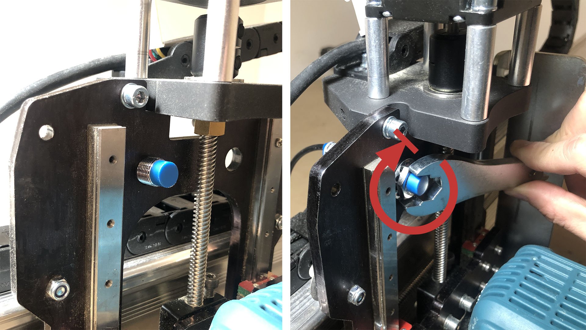 For the Z-axis, remove the nut and washer on the end of one of the inductive sensors. Pass this sensor through either of the two holes on the X-axis gantry plate (pictured), whichever you prefer. Re-install the washer and nut onto the end of the sensor. Leave it loose and use the nuts on either end to adjust where the sensor sits so that the blue tip doesn’t hit the Z-axis gantry at its upper position, then tighten the nuts. The steel wrench included with your LongMill MK2 serves to tighten the 17mm nuts on each sensor as shown.