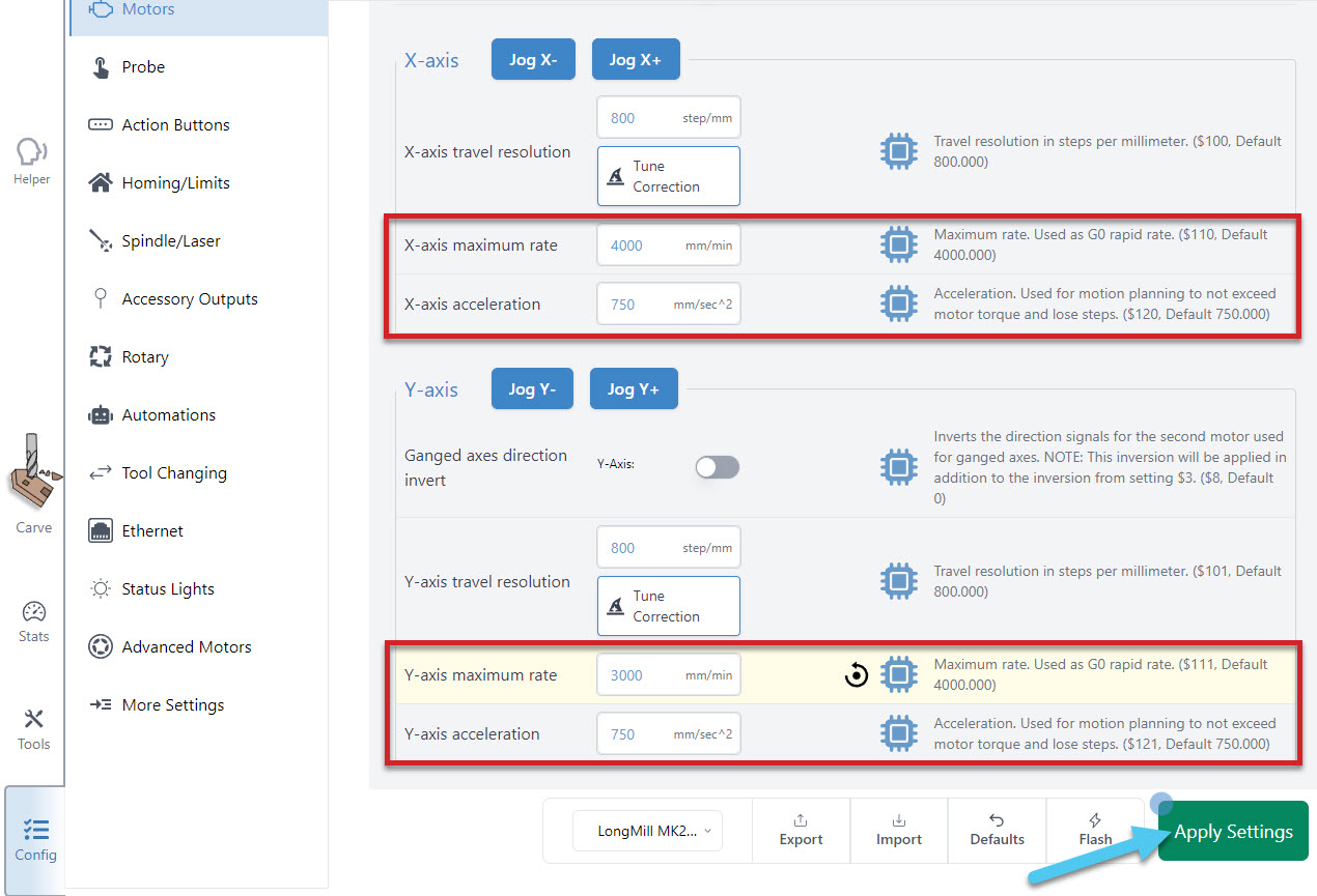 Some settings you might need to change are shown below. If you’re moving a specific axis of the machine and it’s ‘stalling out’/ not moving then you definitely need to update these values. You’d want to focus first on the ‘maximum rates’ (110 to 112), reducing the value for the stalling axis by increments of 100 until the problem goes away. If this doesn’t work you can also try lowering the ‘acceleration’ values (120 to 122). Don’t forget to hit the Apply Settings button once any changes are made to these values.