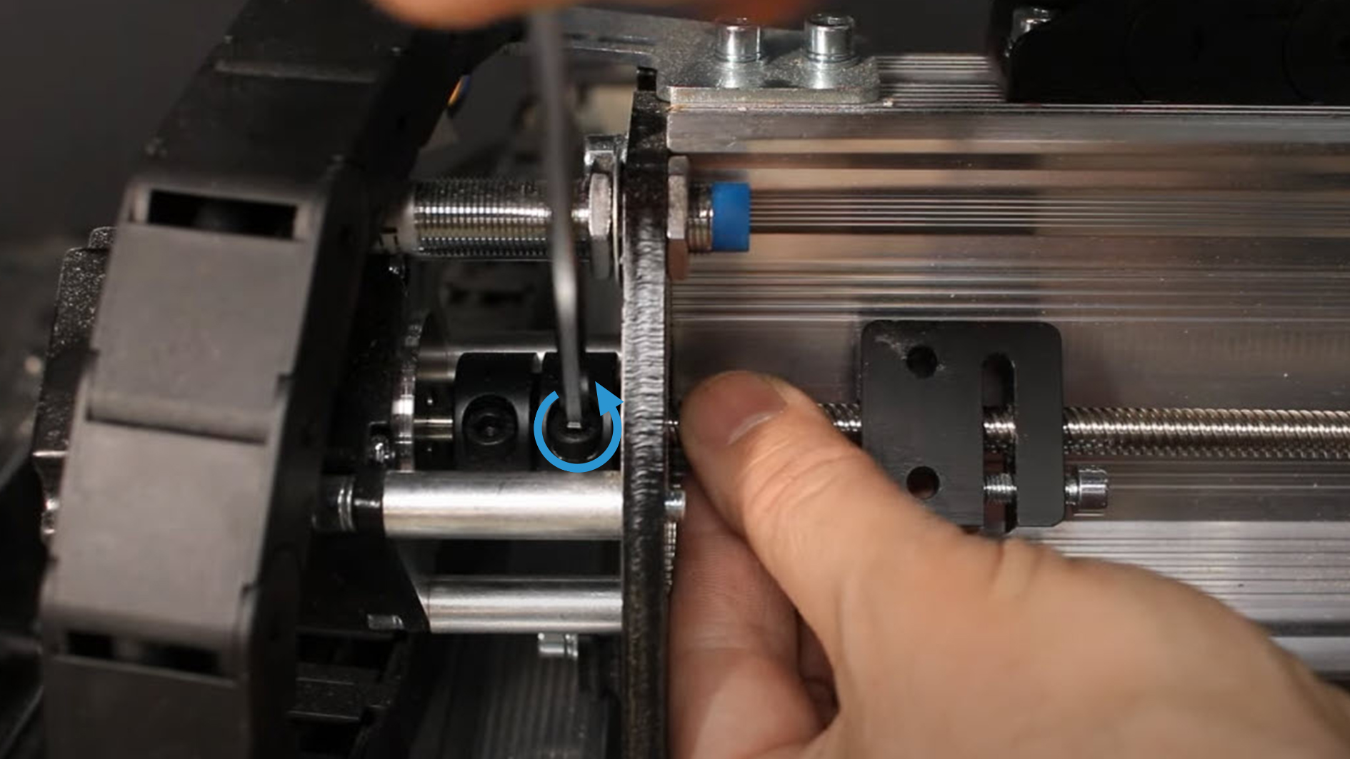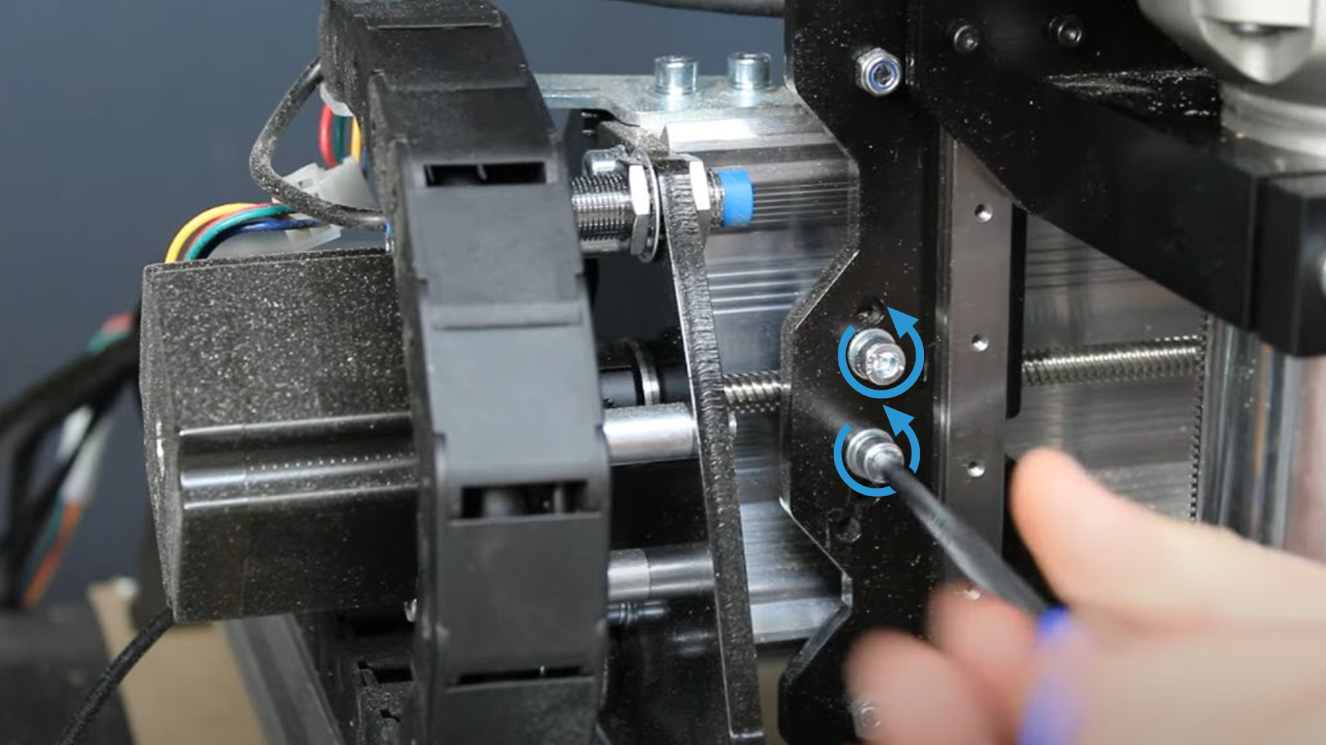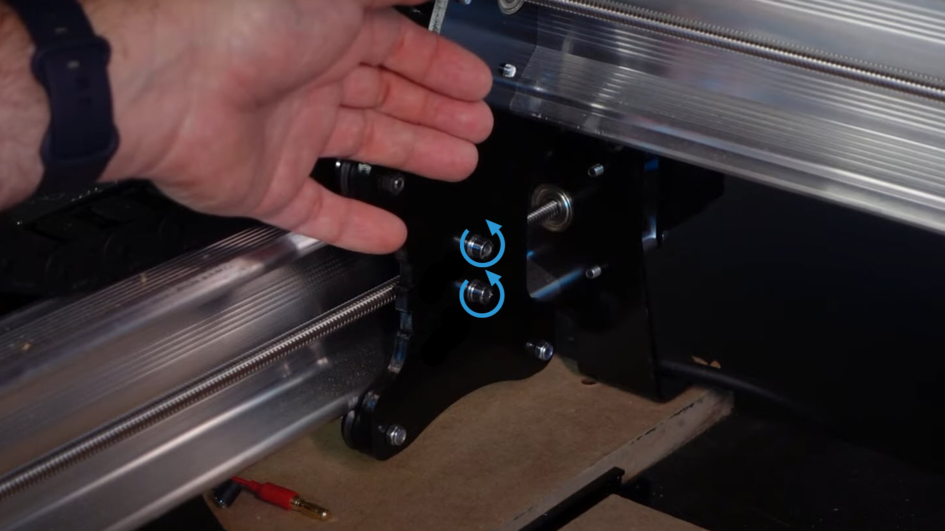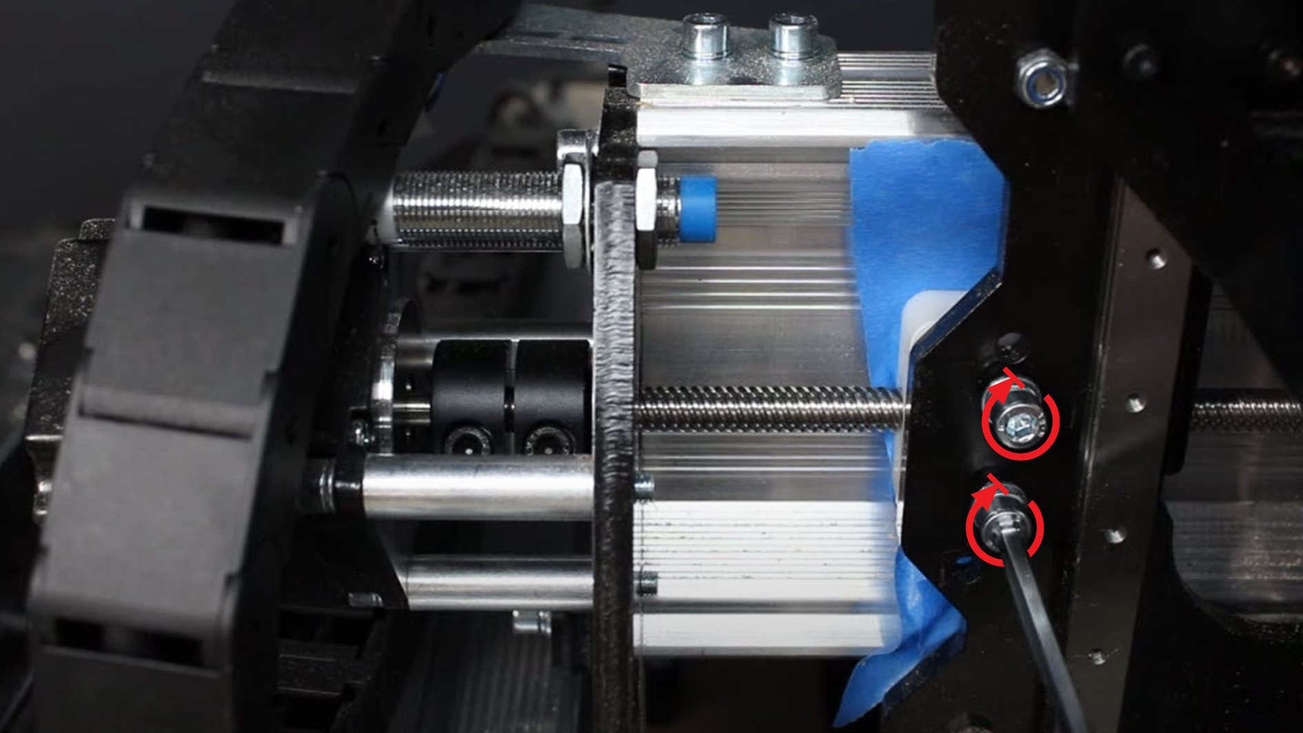- With your Allen key, remove the two M5 mounting screws from the backlash nuts on the Y-axis plates on both the left and right sides. Once they’re removed, manually push the Y-axis away from the nuts so you can reach them underneath.