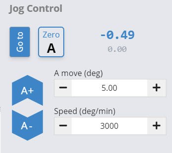 A “rotary” mode is also built into gSender, where you will find jog controls for the rotary axis along with options for probing and zeroing the X, Z, and A-axes. When rotary mode is enabled within gSender, this will allow for movements on your A-axis/rotary axis that are up to 8000 mm/min, allowing reasonable feed rates when cutting small diameter stock. You can see that switching the rotary slider sets $111 to 8000 in the firmware tab.