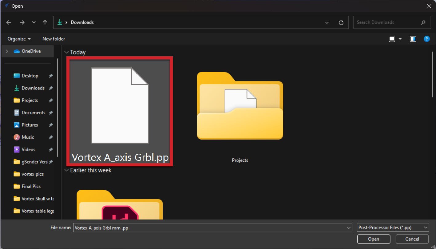Select the Vortex A-axis Grbl.pp file from your recent download.