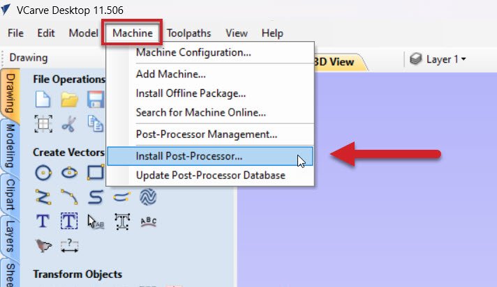 To install these post processors in VCarve Desktop, select Install Post-Processor under the Machine tab.