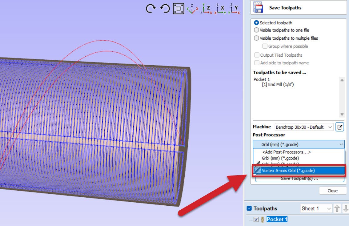 Now when you go to save your toolpath, you will be able to select the correct post processor for your rotary project!