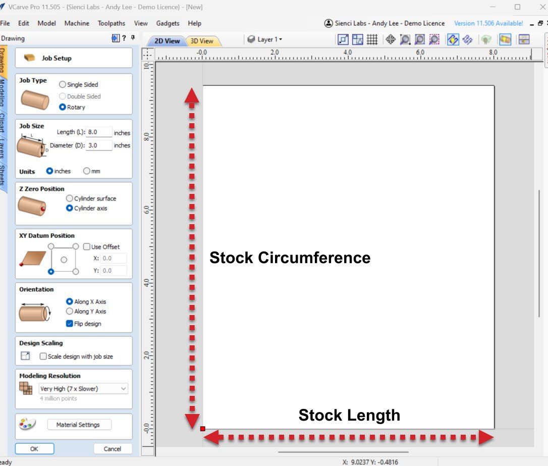 Your 2D view will now represent the outer surface of your material, where the height of the workspace corresponds to the circumference of your material, and the width of the workspace corresponds to the length of your material.