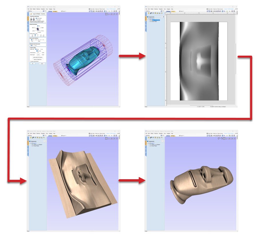 As mentioned in the “The Concept of Wrapping” section above, VCarve operates by wrapping a flat design around a cylinder to create a rotary design. This means that even when you are importing a 3D model, VCarve will first need to “unwrap” the 3D model into a 2D image, with this representation then re-wrapped around a cylinder to form the final shape. This workflow may seem counterintuitive at first, but has major benefits for when you create toolpaths in the next step.