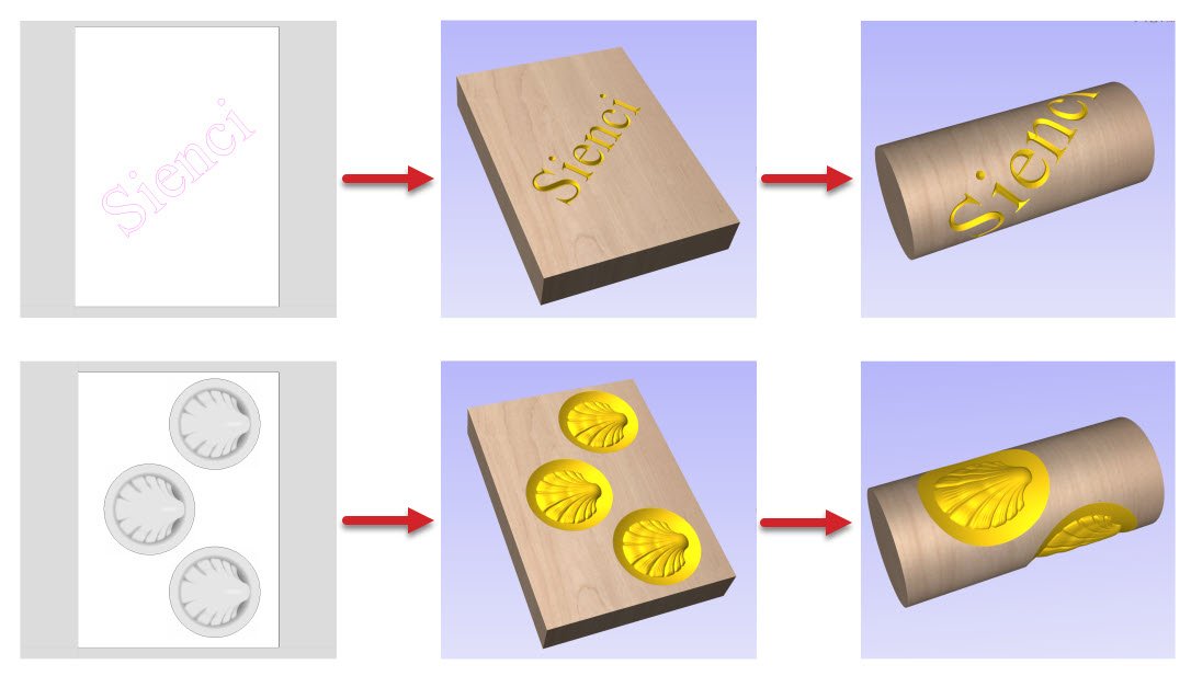 To begin with, it is important for you to understand rotary carvings as single-sided carvings that are wrapped around a cylinder. You still lay out your designs in 2D, but those designs are then wrapped around a cylinder when it is being previewed or carved. If you have ever carved letters or reliefs into a piece of flat material, you can imagine rolling the end results up into a cylinder and you’ve essentially got the gist of rotary carving in VCarve.