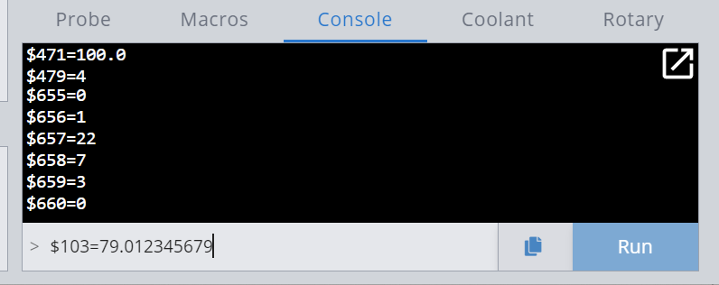 - Click console and input or copy/paste the following exactly, $103=79.012345679, then click RUN. Write this number down in case the settings have been changed back to default.