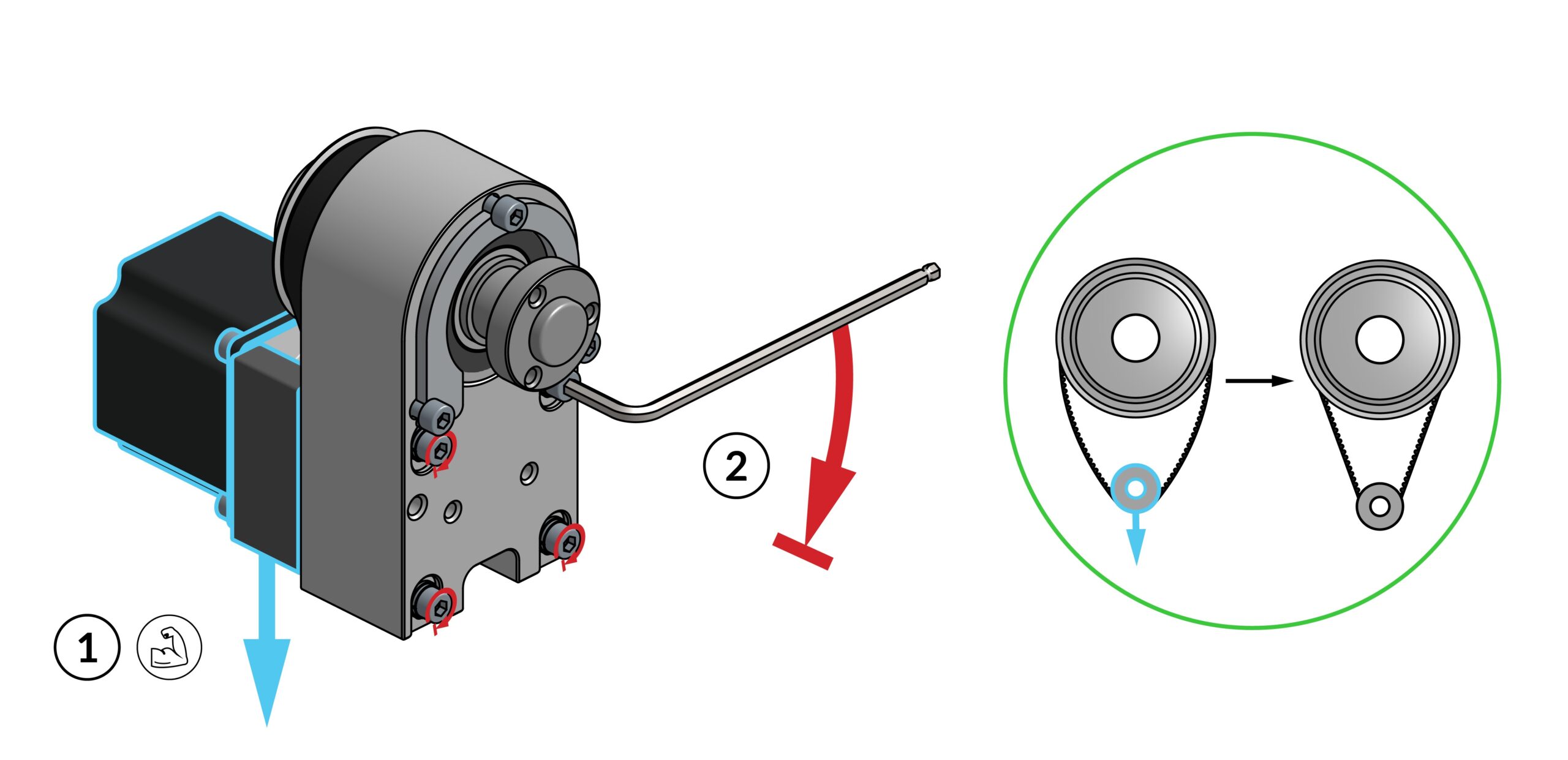 Remove the headstock from the mounting track by unscrewing the four screws at the bottom. Next, remove the 3D printed front lower headstock cover from the headstock to expose the four mounting screws at the front. Slightly loosen each of these screws, then apply a reasonable amount of pressure downwards onto the motor. While holding this pressure on the motor, re-tighten these four screws at the front of the headstock. Like shown in the photo below.