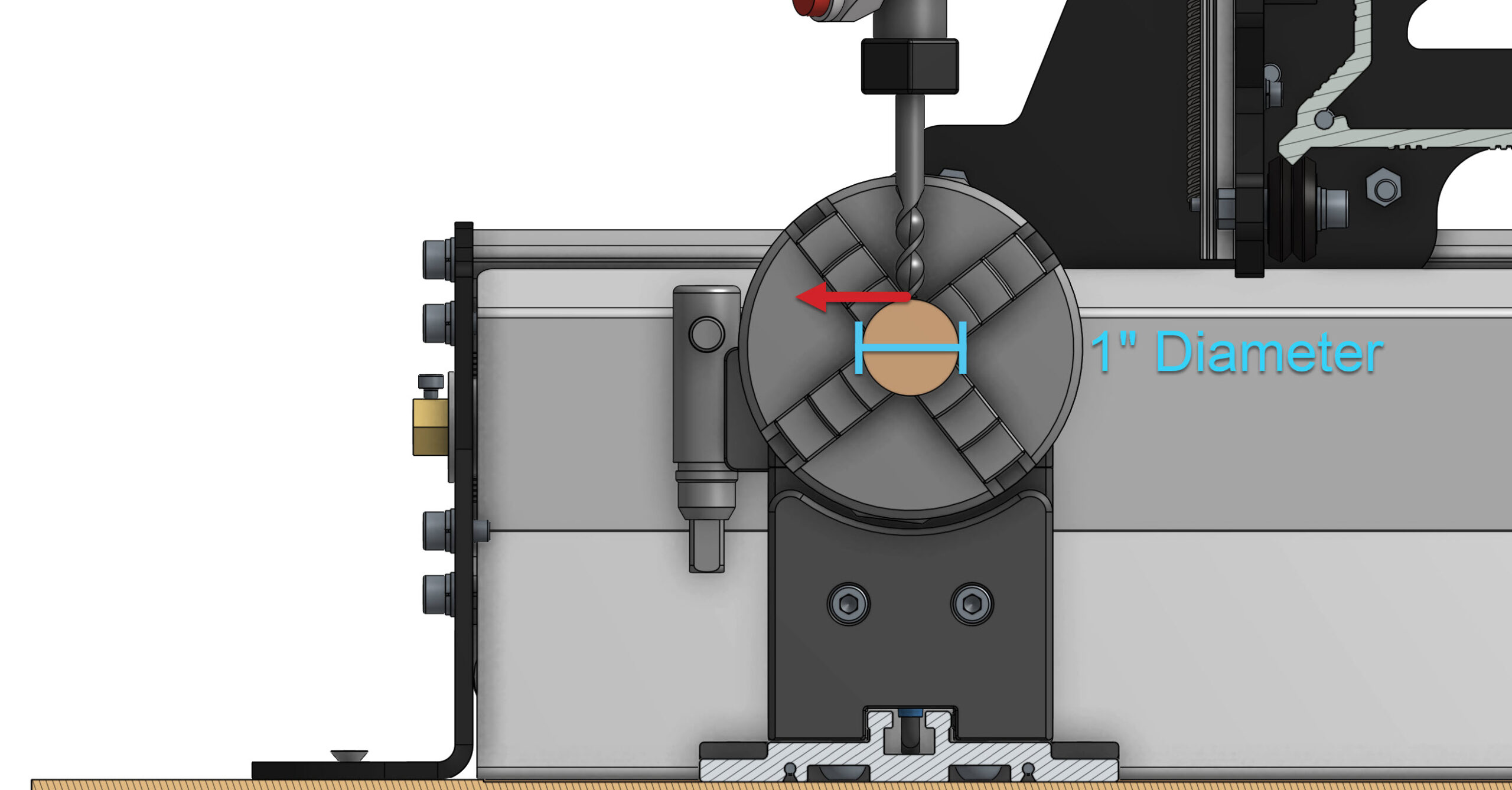 Once we move over to a 1 inch diameter stock, our true feed rate at the surface becomes (34.9 radians/min) X (12.7mm radius) = 443 mm/min feed rate, which is much too slow for what we’d typically use.
